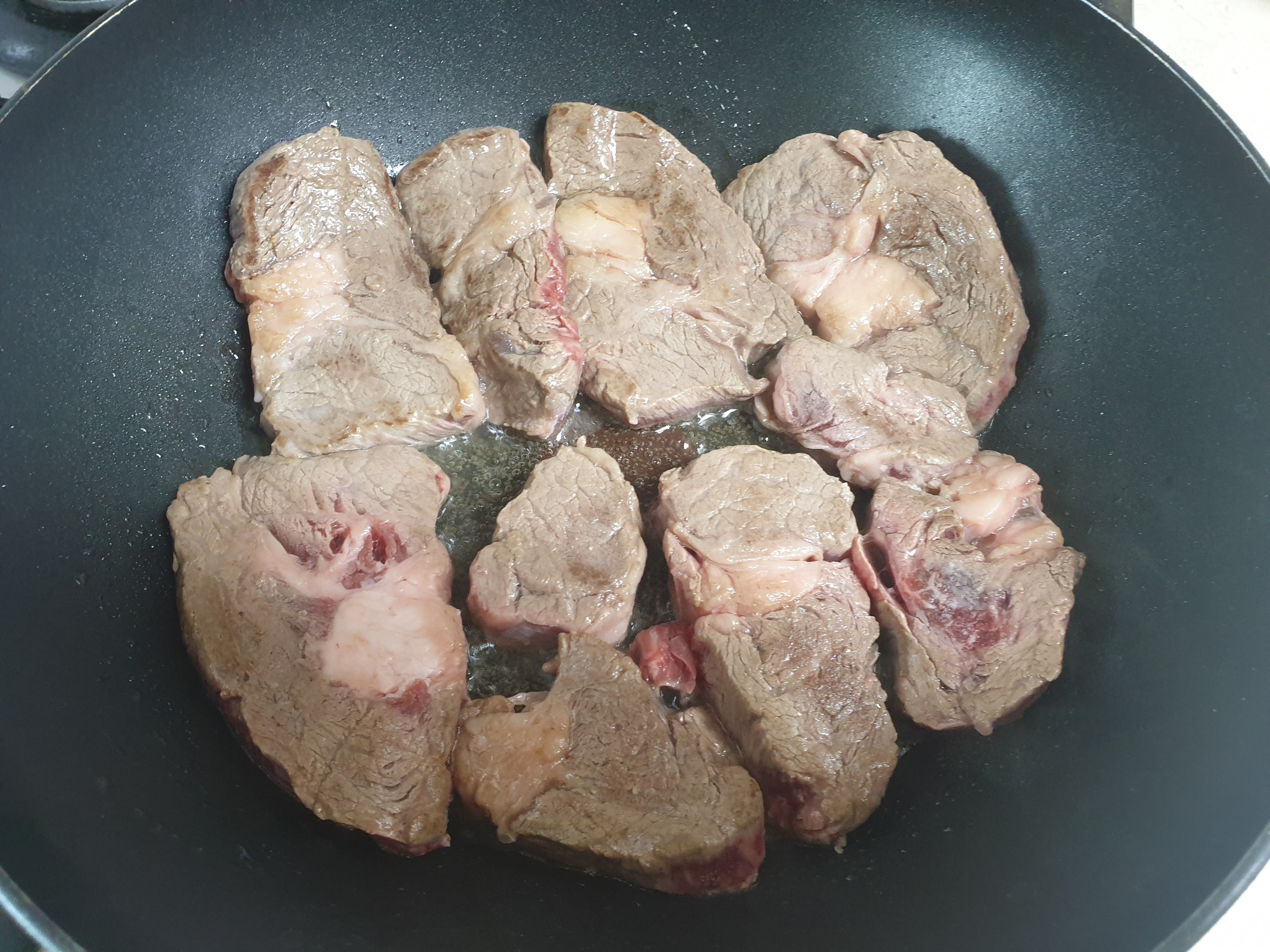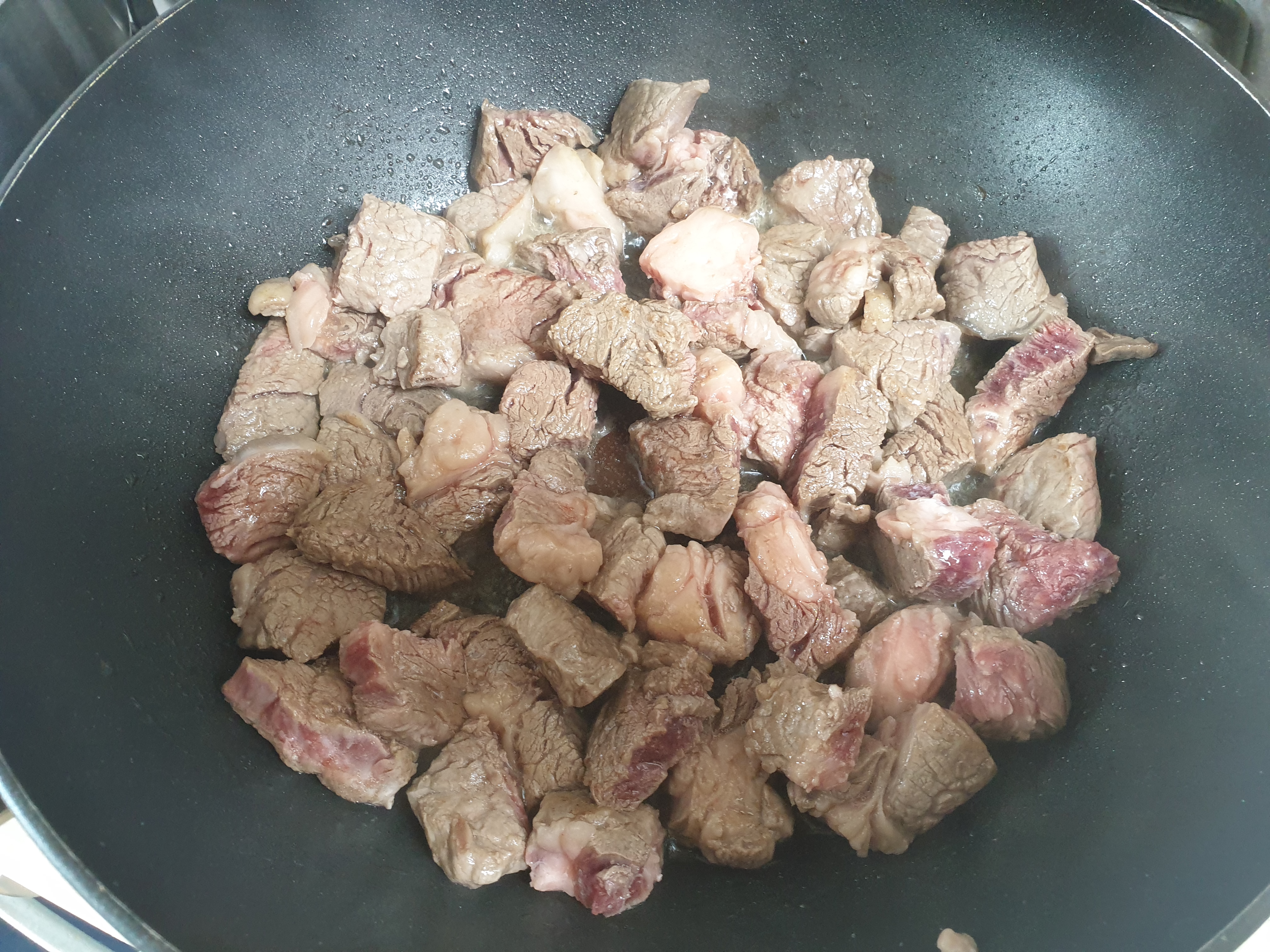 웍에 기름을 두른 후 소고기를 다 넣었습니다