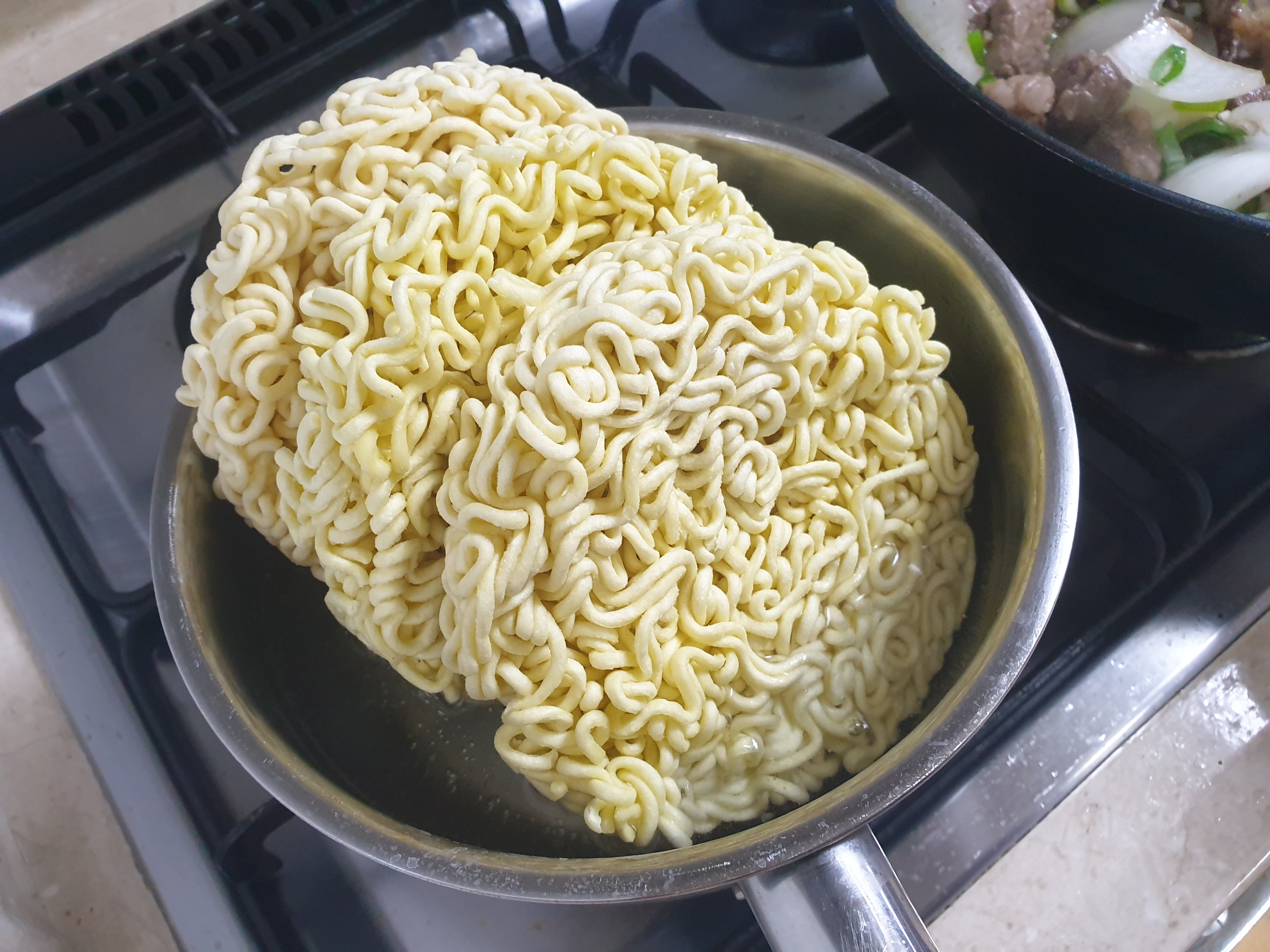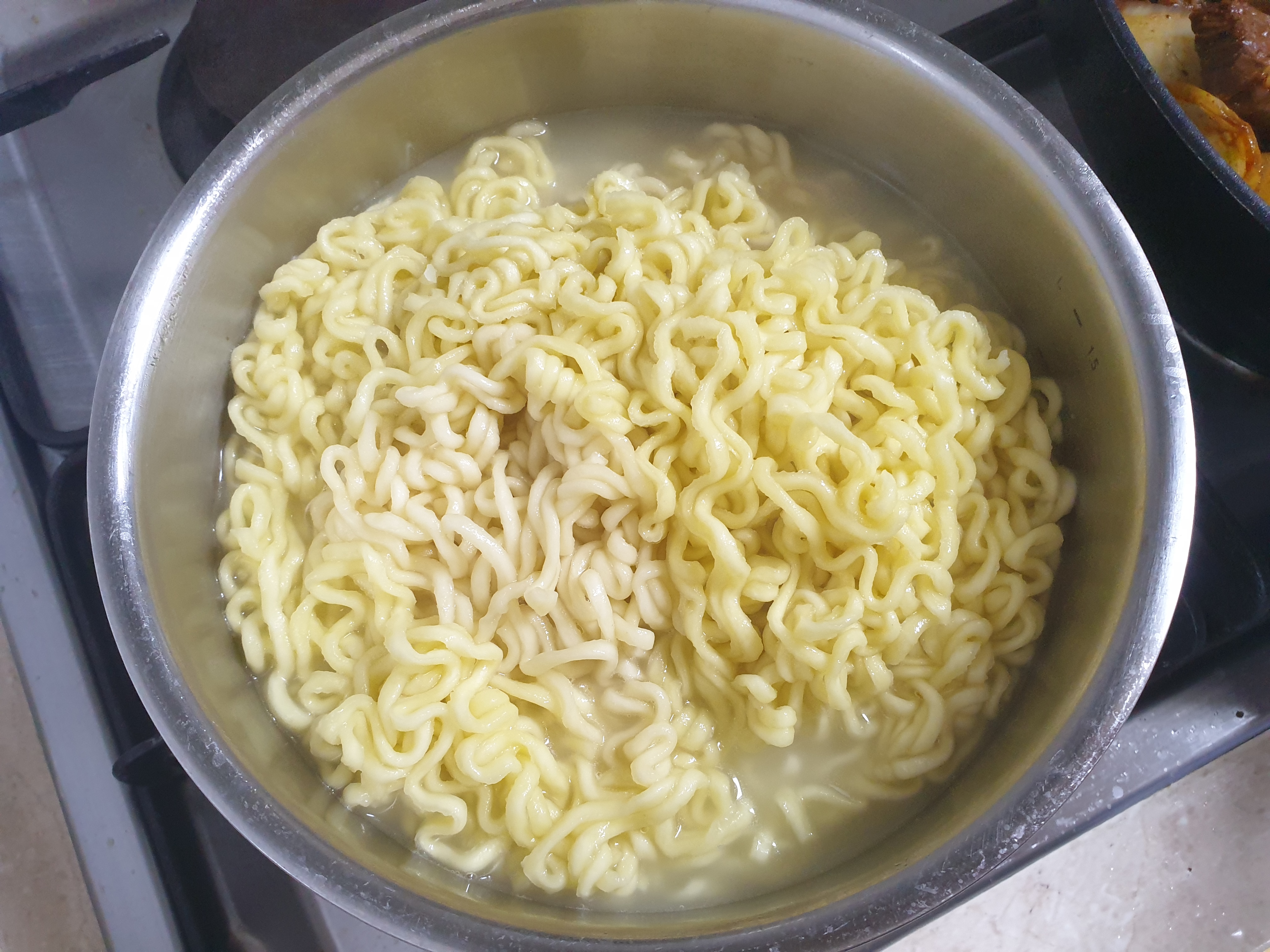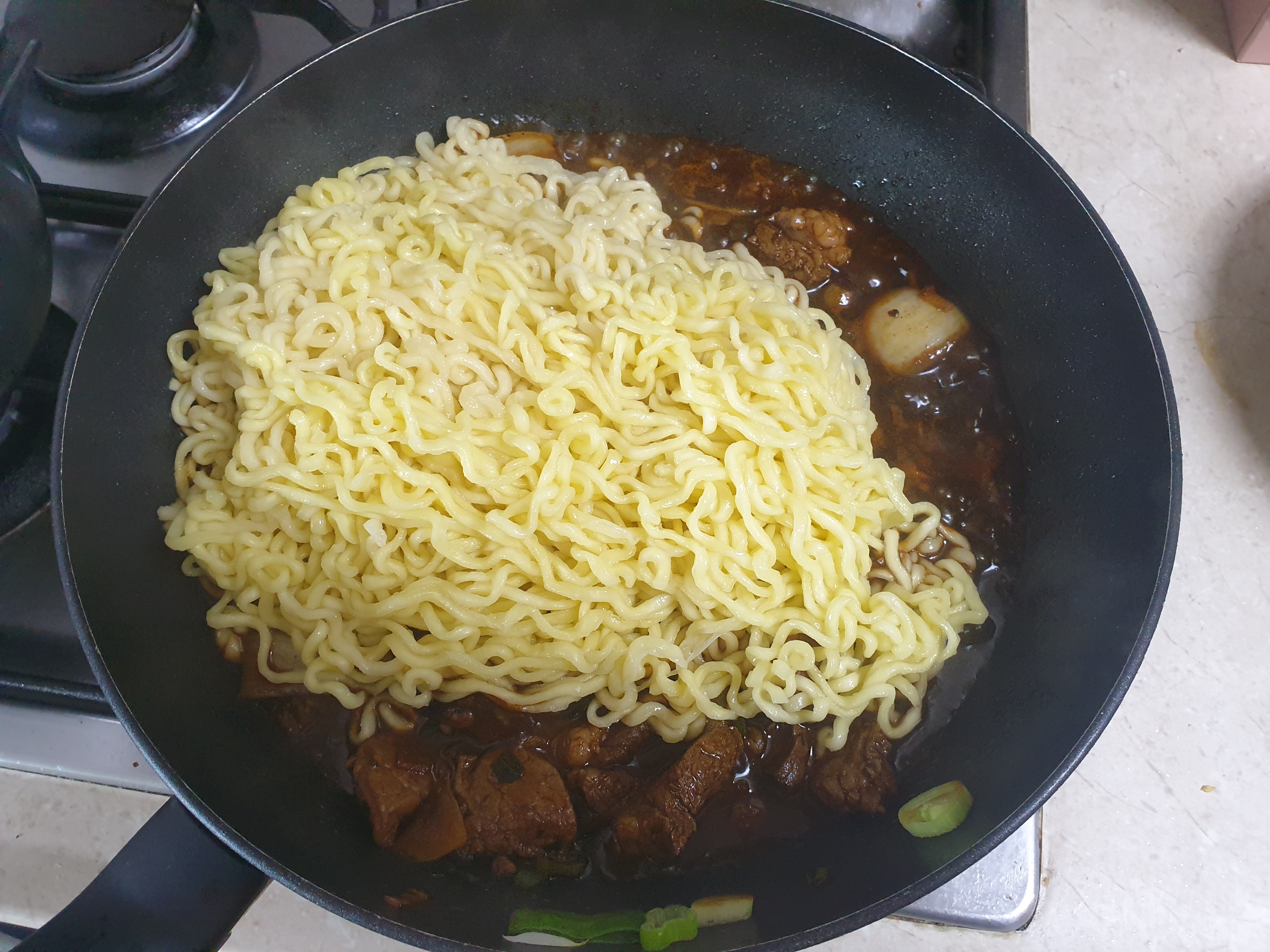 맛있는녀석들의 김준현은 너구리면을 먼저 넣고나서 짜파게티 면을 넣는다고 되어 있었던거 같은데 저는 3개를 한번에 넣었어요