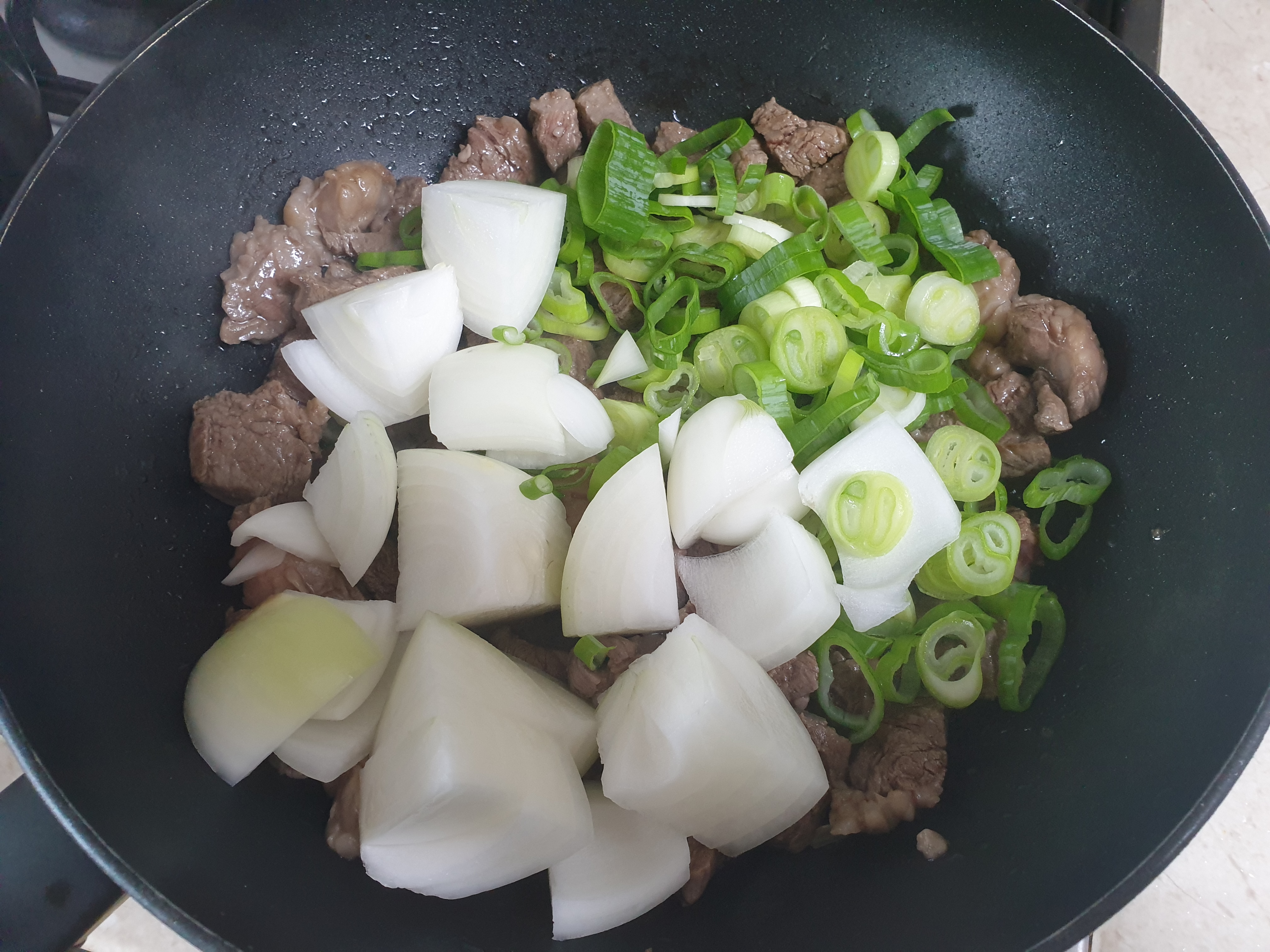 ⓸ 익은 고기에 야채(양파,파) 넣기