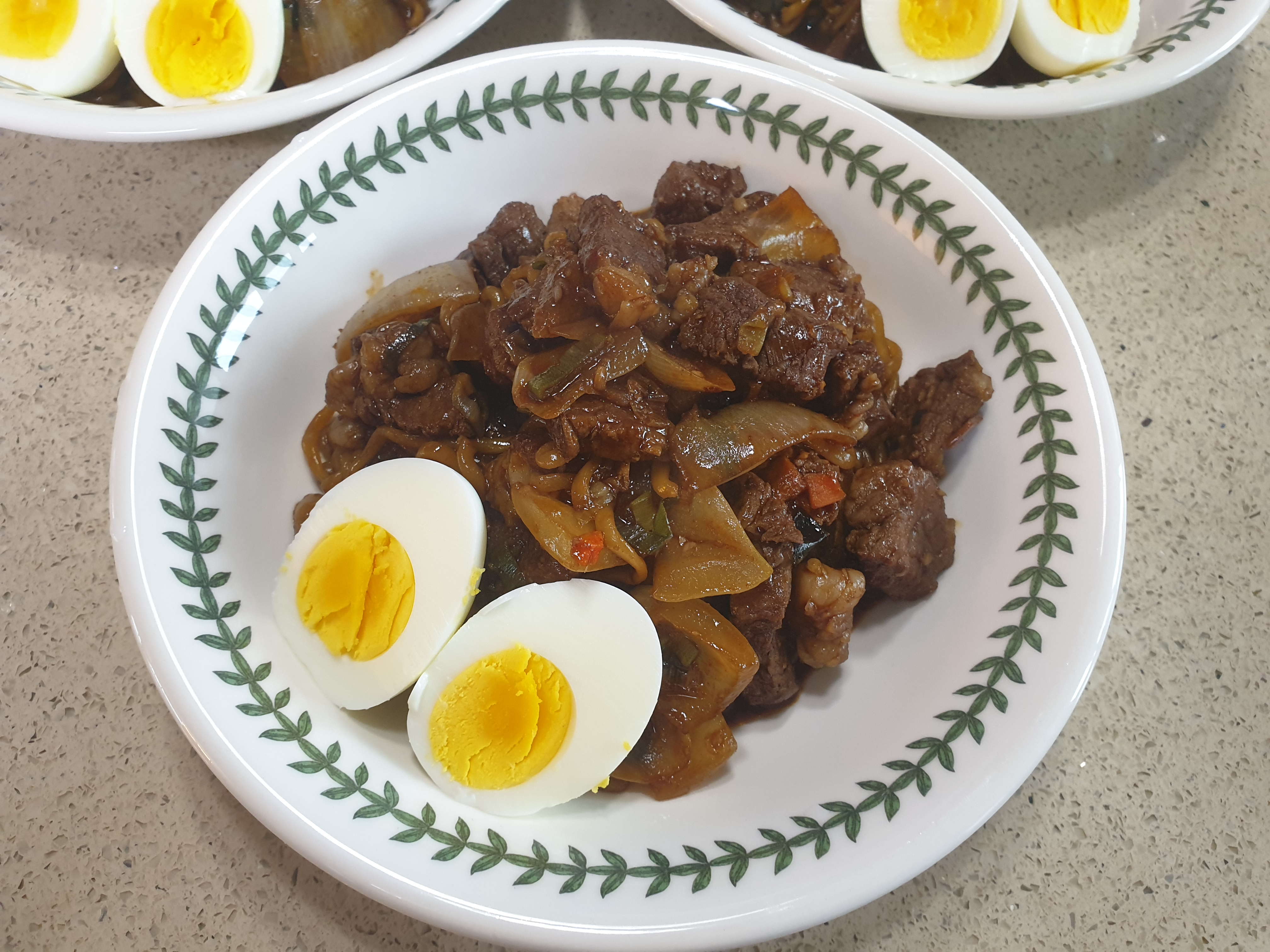⓵ 재료 – 짜파게티, 너구리, 양파, 대파, 삶은계란, 고추장, 설탕, 식용유, 마늘, 구이용 소고기(꼭 채끝살일 필요는 없어요. 저희는 신랑이 채끝살 사오랬는데 스테이크를 자기 먹고 싶은만큼 사왔네요 쩝....)